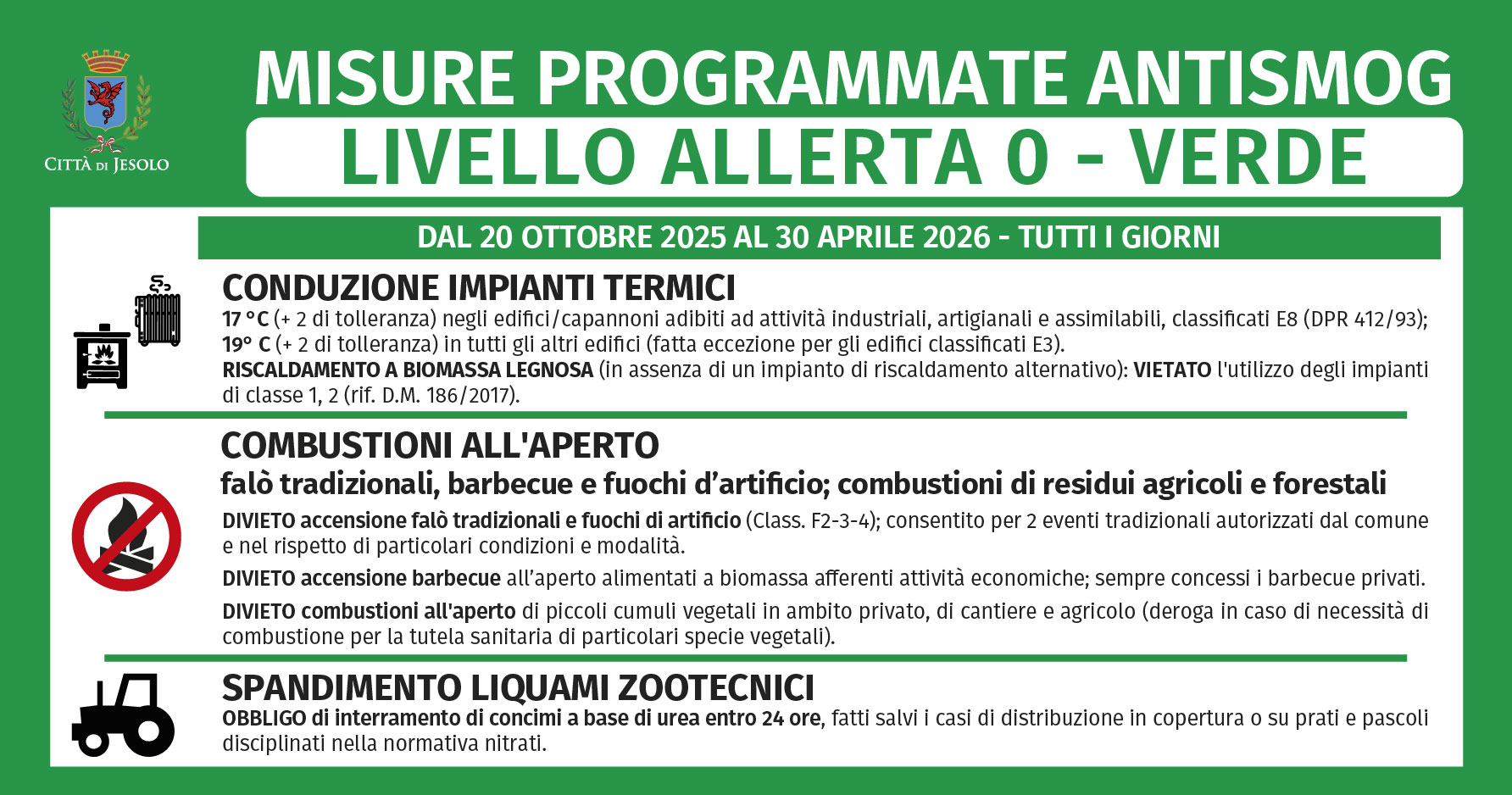 L’Amministrazione comunale di Jesolo aderisce all’adozione delle misure temporanee omogenee per il miglioramento della qualità dell’aria ed il contrasto all’inquinamento da PM10, previste dal Nuovo Accordo di Bacino Padano sottoscritto dalla Regione del Veneto e coordinate dalla Città Metropolitana di Venezia.