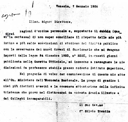 Lettera di dimissioni dall'Università Ca'Foscari di Venezia