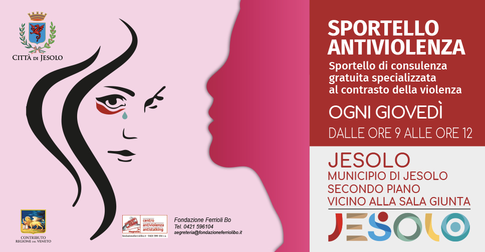 Lo sportello antiviolenza presso il Comune di Jesolo è gestito dalla Fondazione Eugenio Ferrioli e Luciana Bo onlus, quale estensione del suo Centro Antiviolenza ed Antistalking “la Magnolia” sito a San Donà di Piave tel. 0421 596104.