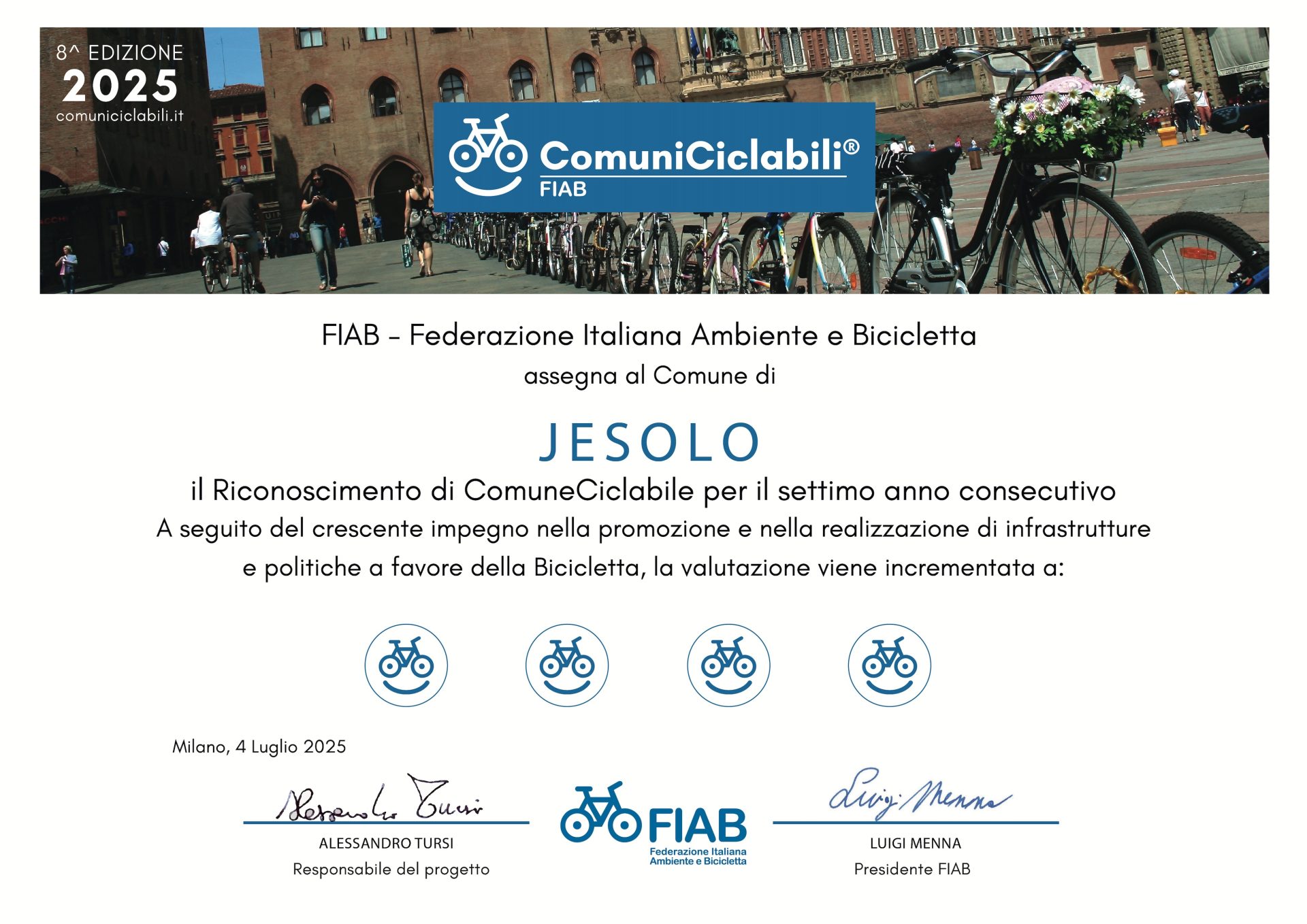 Il Comune di Jesolo ha ricevuto un importante riconoscimento da parte di FIAB (Federazione Italiana Ambiente e Bicicletta), conquistando il quarto BikeSmile, simbolo di un’amministrazione sempre più attenta alla promozione della mobilità ciclabile e sostenibile. Fino ad oggi Jesolo si era fermata a tre BikeSmile, ma l’ulteriore passo in avanti testimonia l’efficacia delle politiche attuate e l’impegno continuo sul tema.