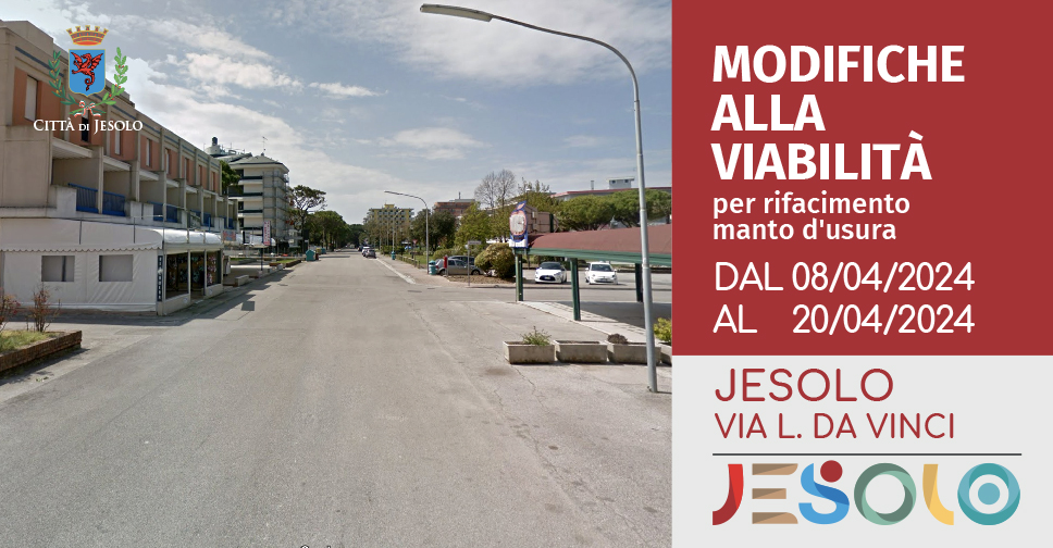 L'Amministrazione comunale informa che, dal 8 al 20 aprile, via Leonardo Da Vinci sarà interessata da lavori di rifacimento del tappeto d'usura.