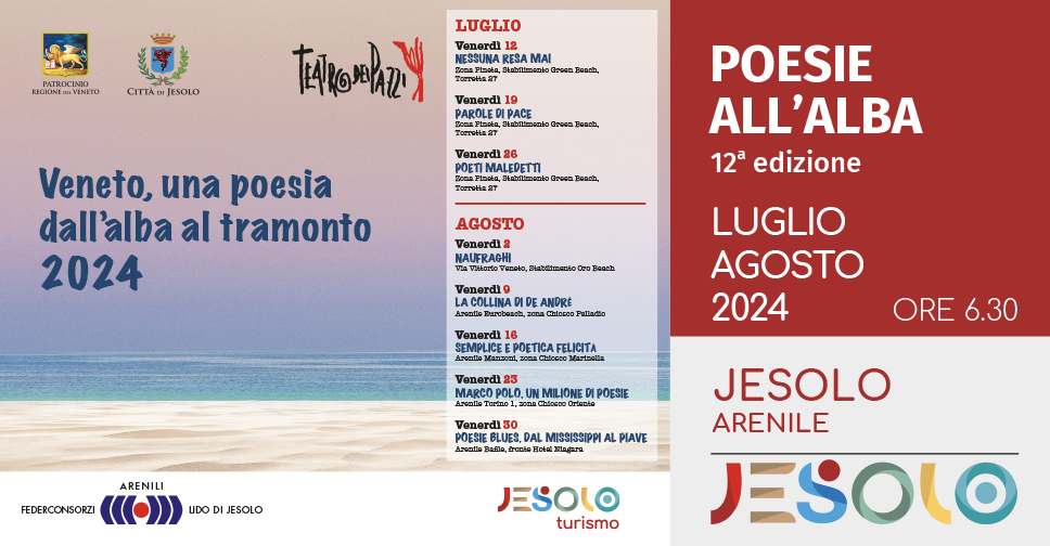 Torna a Jesolo Poesie all'alba, la dodicesima edizione della rassegna che invita ad ascoltare versi e note sulla sabbia.