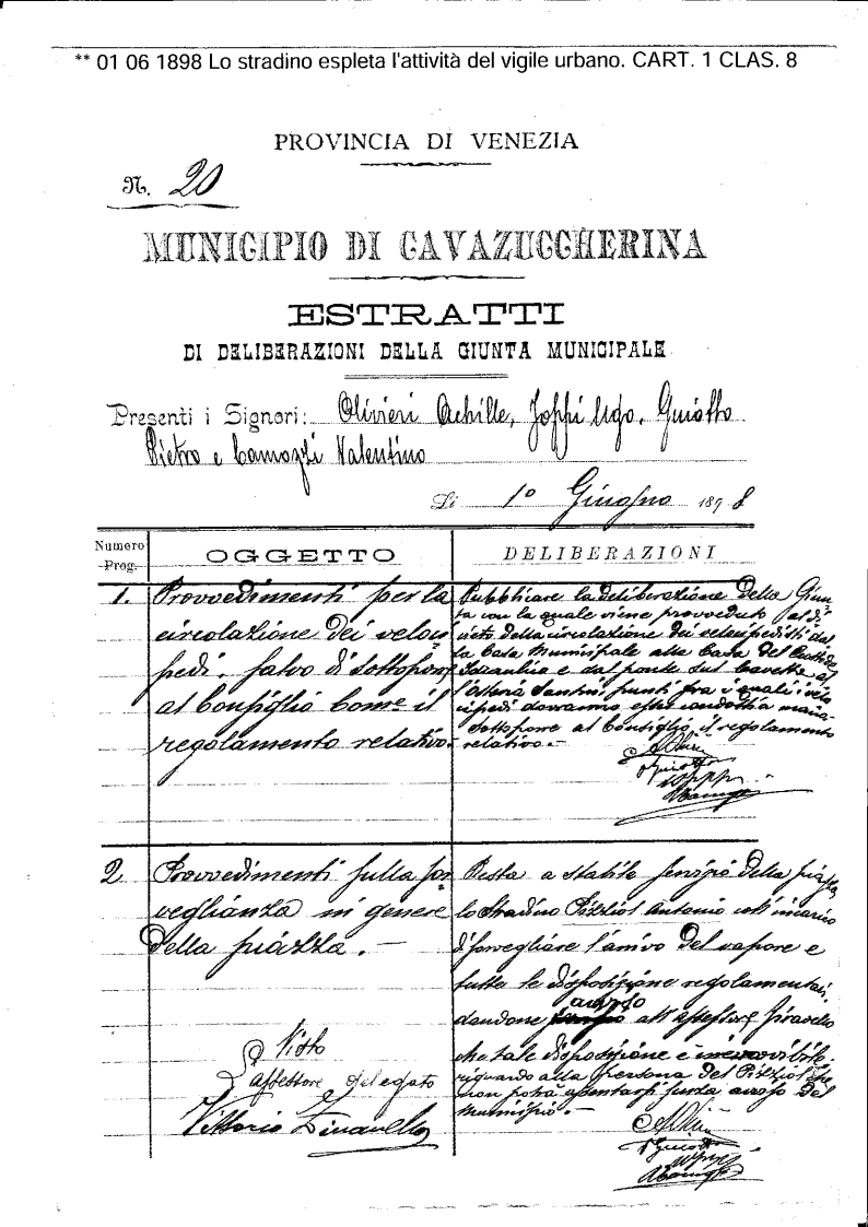 La delibera del 1898 restituisce uno spaccato significativo della Jesolo di fine Ottocento, evidenziando come l’amministrazione comunale dell’epoca avesse già avvertito l’esigenza di affidare a una figura dedicata compiti di manutenzione, vigilanza e ordine pubblico. Lo stradino Antonio Pizziol, incaricato ufficialmente dalla giunta, rappresenta quindi il primo embrione di quella che oggi è la moderna Polizia Locale, struttura centrale per la sicurezza urbana e la vivibilità della città. L’atto istituisce il “divieto della circolazione dei velocipedisti dalla casa municipale alla casa del custode idraulico e dal ponte sul Cavetta all’osteria Santin”, punti fra i quali i velocipedi avrebbero dovuto essere condotti a mano, e affida a Pizziol “l’incarico di sorvegliare l’arrivo del vapore e tutte le disposizioni regolamentari”.