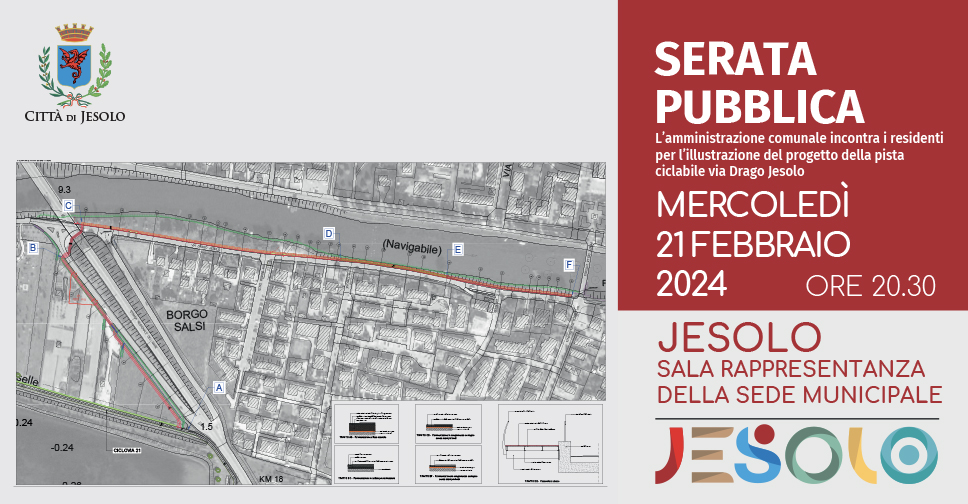 Mercoledì 21 febbraio 2024 alle ore 20.30, presso la Sala Rappresentanza del Municipio, l'amministrazione Comunale incontra i residenti per illustrare il progetto della pista ciclabile di via Drago Jesolo.