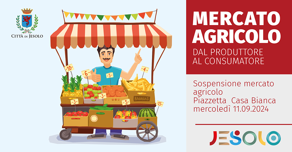 Si avvisa che mercoledì 11 settembre 2024 il mercato di Piazzetta Casa Bianca è sospeso, in quanto la piazza è occupata da una mostra statica di velivoli allestita in occasione della manifestazione "Jesolo Air Show".
