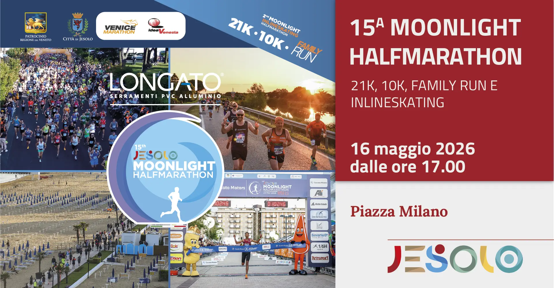 Sabato 16 maggio 2025 torna la Jesolo Moonlight Half Marathon, la corsa internazionale su strada organizzata da Venicemarathon in collaborazione con la Città di Jesolo.