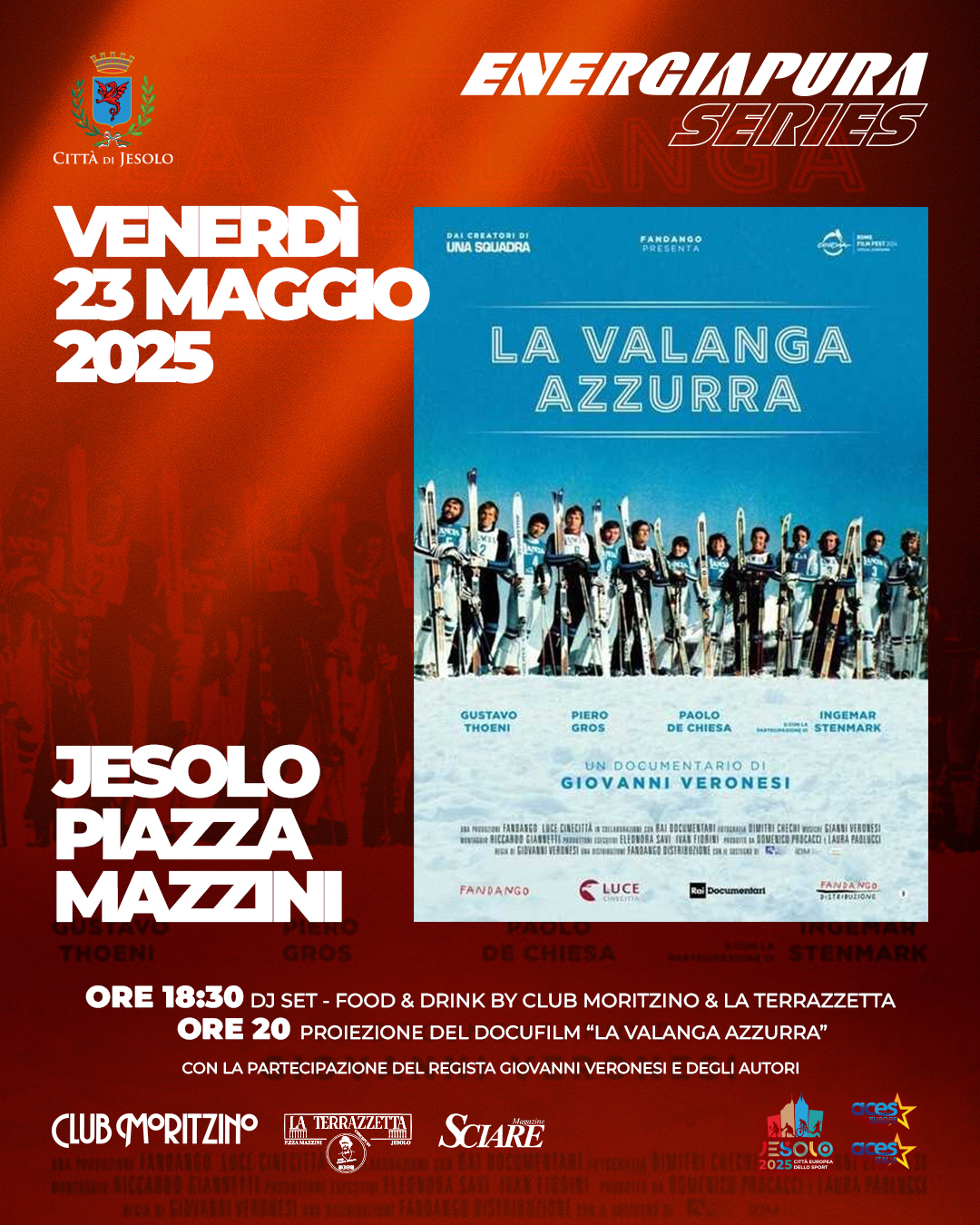 Ad anticipare l’evento, nella serata di venerdì 23 maggio, Piazza Mazzini ospiterà la proiezione del docufilm LaValanga Azzurra, omaggio alla leggendaria squadra italiana di sci che ha segnato un’epoca. Alla serata parteciperanno il regista Giovanni Veronesi e il coautore Lorenzo Fabiano. Alla proiezione seguirà un momento di approfondimento e interviste con il direttore della rivista Sciare, Marco Di Marco.