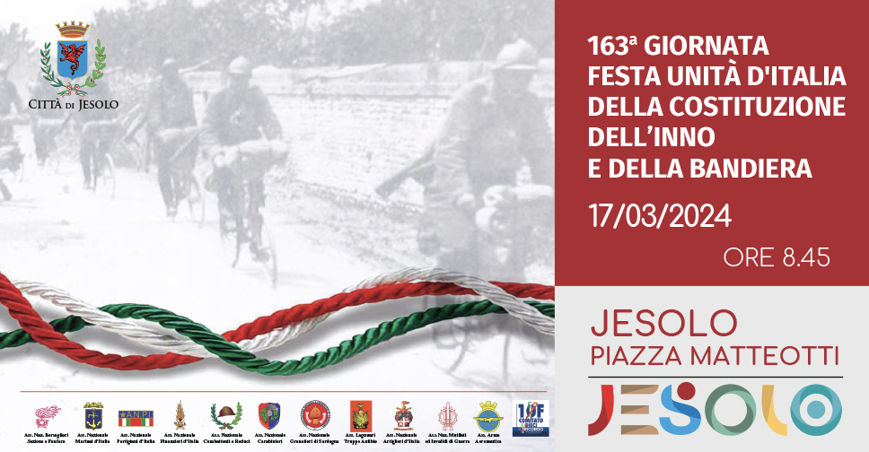 Domenica 17 marzo 2024, in Piazza Matteotti a Jesolo, si celebra la 163^ Festa dell'Unità d'Italia, della Costituzione, dell'Inno e della Bandiera.