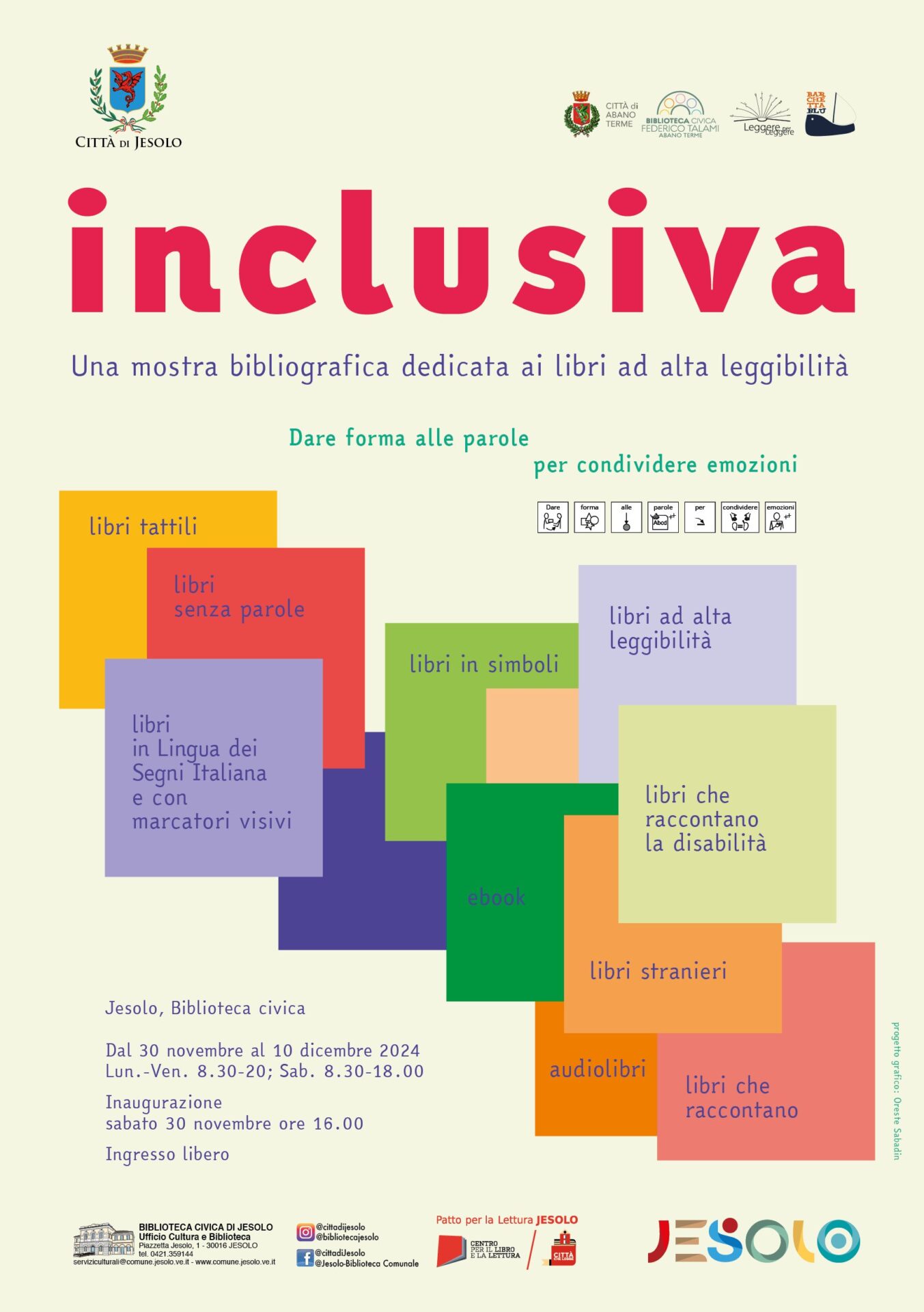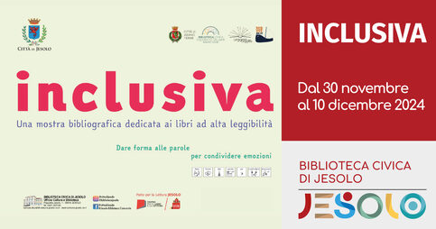 La Biblioteca civica di Jesolo ospita, da sabato 30 novembre a martedì 10 dicembre 2024 la mostra bibliografica Inclusiva dedicata ai libri ad alta leggibilità.