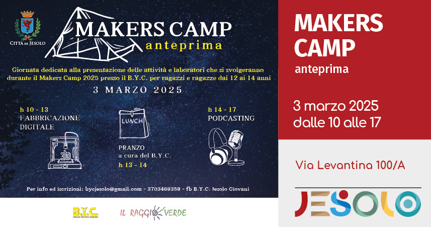 Il Comune di Jesolo, in collaborazione con il B.Y.C., organizza una giornata di presentazione dedicata al Makers Camp 2025, il camp rivolto a ragazzi e ragazze dai 12 ai 14 anni che unisce apprendimento tecnologico e creatività digitale.