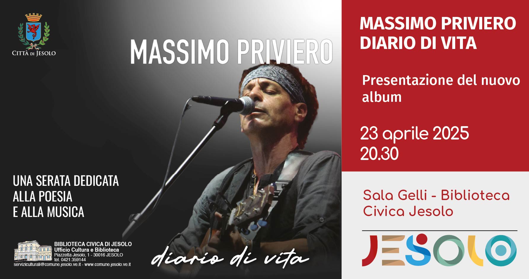 Il Comune di Jesolo è lieto di annunciare una serata dedicata alla musica e alla poesia con Massimo Priviero, in occasione della presentazione del suo nuovo album Diario di una vita.