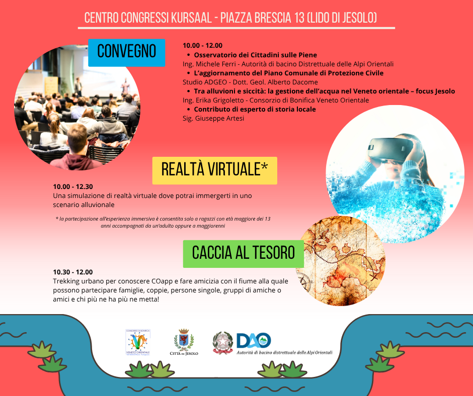 - 10:00 - 12:30: “Safer water: cosa fare in caso di alluvione?” Una simulazione di realtà virtuale dove potrai immergerti in uno scenario alluvionale. Dai 13 anni