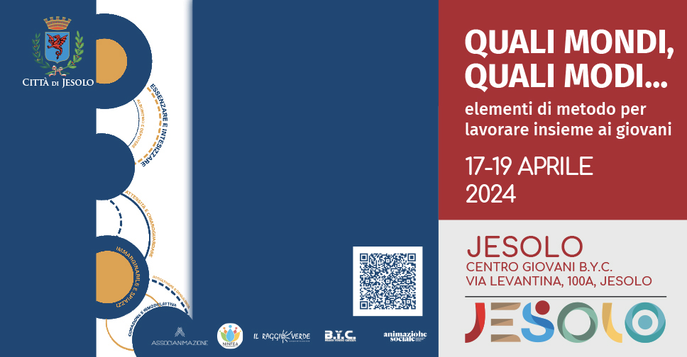 Dal 17 al 19 aprile 2024 il Beach Young Center di Jesolo ospita "Quali mondi, quali modi..." uno spazio in cui gli operatori, che a diverso titolo lavorano con i giovani, possono fare esperienza di sé in relazione con alcune questioni "urgenti" che riguardano il mondo, acquisendo consapevolezza per nuove modalità di azione con i giovani.